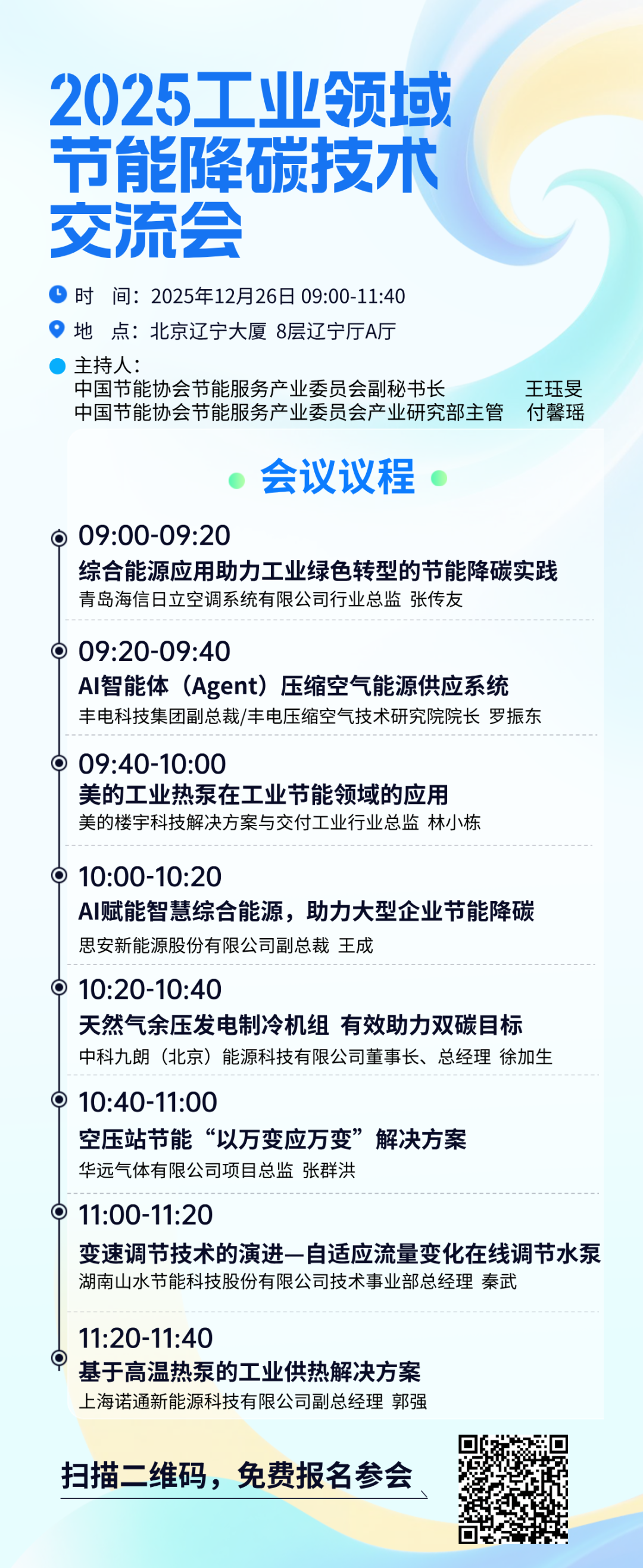 为深入贯彻党的二十届四中全会精神,加快经济社会全面绿色转型,促进绿色低碳先进适用技术落地应用,中国节能协会节能服务产业委员会(EMCA)将于2025节能服务产业年度大会期间举办“工业领域节能降碳技术交流会”。现就有关事项通知如下: