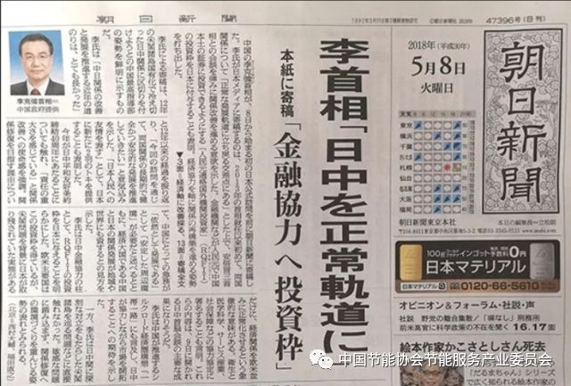 让中日和平友好事业再起航 5月8日,李克强总理在日本最具影响力的报纸之一《朝日新闻》发表署名文章 《让中日和平友好合作事业再起航》 今年,是中日和平友好条约缔结 40 周年,也是中日关系重要而关键的一年。 由李克强总理访日,以及在日本三大综合性日文对开报纸之一的《朝日新闻》上发表了署名文章 李克强总理在署名文章中提到 “ 我在同日本经济界人士的接触中得知,不少日本企业愿分享“一带一路”倡议带来的广阔机遇。的确,中日经济互补性很强,在新一轮科技与产业革命浪潮中,拓展节能环保、科技创新、高端制造、财政金融、共享经济、医疗养老等多领域务实合作有着广阔前景,两国企业开展第三方市场合作拥有巨大潜力。此访期间,我们将见证两国在卫生和医学科学、服务产业、社会保障等领域一系列合作协议的签署,中方将同日方商签本币互换协议,并宣布给予日方合格境外投资者(RQFII)额度。可以说,中日互利双赢合作面临提质升级的新机遇。 这是距离中国总理上一次2011年5月访日后,时隔多年,中国总理再次访问。这一正式访问显然是两国关系改善提升的重要标志。抓住制造业升级改造的机遇 继续推进节能环保等合作第十一届中日节能环保综合论坛,EMCA与日本三井住友融资租赁(中国)有限公司在中日两国部长的见证下签署合作协议 “十三五”时期,中国将加快创新驱动发展,实施“中国制造2025”,推动制造业向自动化、智能化、服务化转变,由粗放型向集约型转变。中国产业将迈向中高端水平,制造业面临升级改造,需要大幅提升技术水平和满足节能环保需求,意味着中国企业正在进入新一轮生产设备和工艺更新换代期。 日本具有精密机床、仪器仪表、智能制造、清洁装备、生物技术等优势,双方在这些领域的技术创新交流和人员培训等方面的合作可谓商机无限。当前,加快经济结构调整、转变发展方式,是可持续发展道路,是中日面临的共同课题,对两国经贸关系发展既是挑战也是机遇。两国企业加强在节能环保、新能源、循环经济等领域的合作,有利于双方开拓新的市场,更好地实现互利共赢日两国实现可持。 日本在节能环保、绿色循环经济和高科技等领域不仅有着世界先进的节能环保技术,也有着成熟的生产和技术输出经验。对中日两国企业而言,发挥各自优势,实现绿色技术与市场资源有机结合,是拓展该领域合作的根本方向。 精诚合作,助力中国节能环保事业 中国节能协会节能服务产业委员会(EMCA)与三井住友银行(中国)有限公司、三井住友融资租赁(中国)有限公司签署战略合作框架协议。 未来,三方将针对节能减排领域,将加强在政策、市场、技术等方面的研究与共享,深化投融资方面的创新与合作,为中国节能服务企业提供投融资解决方案。 三井住友银行股份有限公司 三井住友银行拥有日本国内屈指可数的坚实业务基础与高效的战略执行力,同时凭借强劲的集团优势,发挥卓越的金融服务能力。 团结在三井住友金融集团旗下,三井住友银行将继续与其他集团携手,为客户提供高品质的复合型的金融服务。 三井住友银行股份有限公司网店数:日本总行、分行共440家;海外分行18家 三井住友金融租赁株式会社 三井住友金融租赁株式会社是由三井住友金融集团和住友商事共同出资设立的金融租赁公司,在日本隶属于日本金融厅(相当于中国银监会)管辖。 截至2016年底,三井住友金融租赁株式会社总资产规模约折合3000亿人民币左右。在日本拥有31家分支机构,在日本以外的亚洲国家拥有9家分支机构,在欧洲拥有4家分支机构,在北美洲拥有2家分支机构。其中,在华分支机构包括:上海公司、广州公司、北京公司、成都公司。